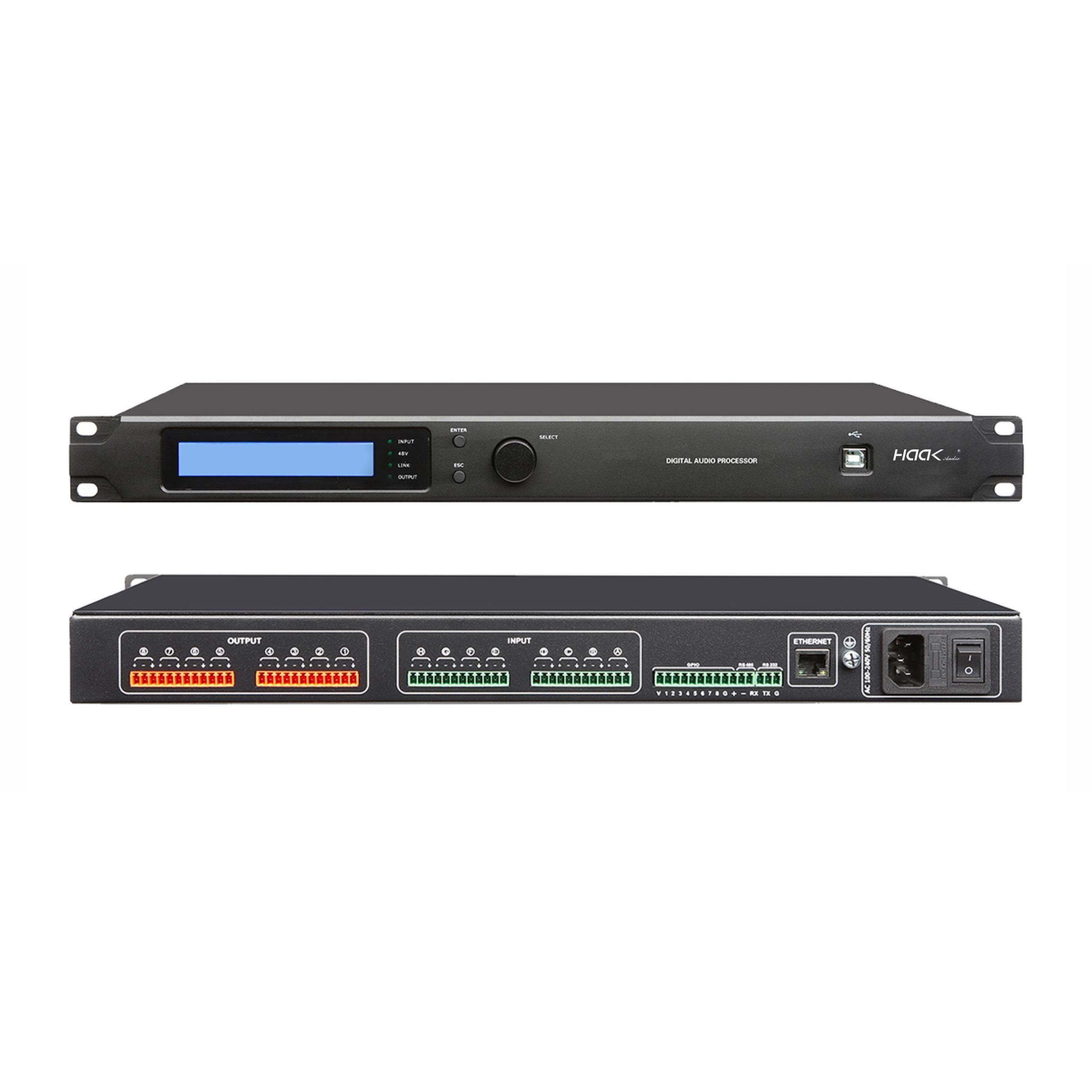 采用ADI SHARC 21489的处理芯片,它基于64位浮点DSP引擎、功能强大的数字音频信号处理平台。产品提供了广泛的数字处理工具,用于音频系统设计、配置和优化。DSP Controller软件可完全控制和管理整个系列的DSP,其处理功能主要包括:AFC、AEC、ANS、AM、AGC、PEQ、延时、分频、矩阵等功能。